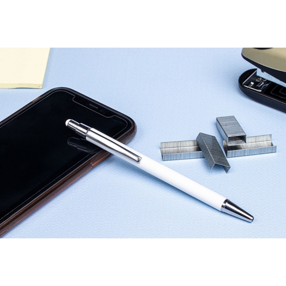 Długopis z aluminium z gumowaną powierzchnią. Posiada wkład piszący na niebiesko i końcówkę do obsługi ekranów dotykowych.