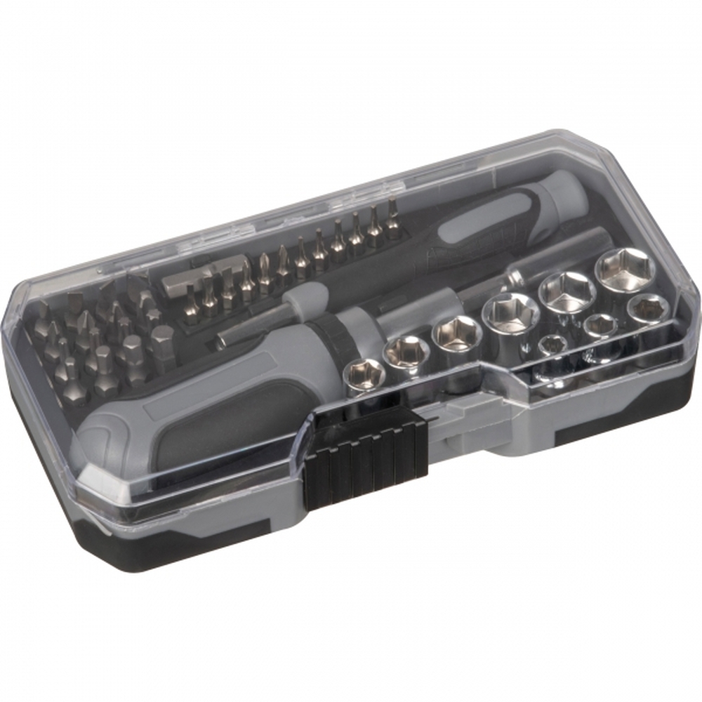 Zestaw 41 bitów i nakrętek oraz dwa uchwyty, całość w poręcznym pudełku.